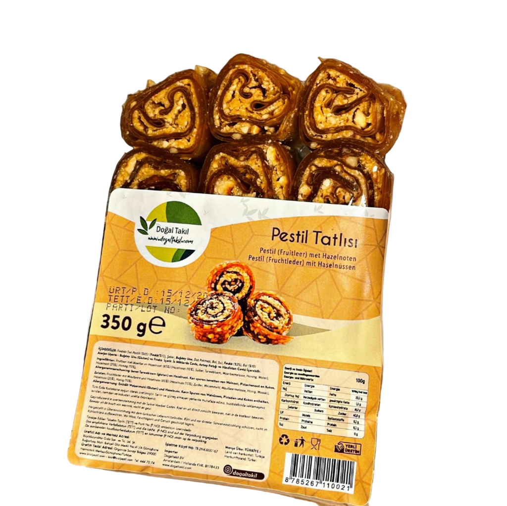 Pestil tatlısı ürünümüz Gümüşhane’de tamamen geleneksel yöntemlerle üretilmiştir. İçindekiler: Fındıklı dut pestili (%65) Fındık (%25), şeker, buğday unu, dut pekmezi, bal, su, bal (%10) Alerjen Uyarısı Buğday unu (gluten) ve fındık içerir.