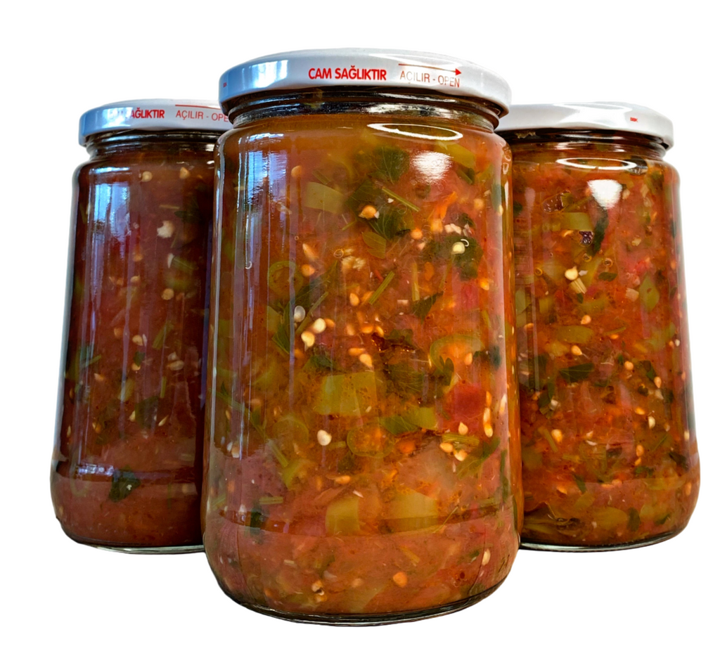 İçindekiler; Domates, acı biber, sarımsak, tuz, maydanoz, üzüm sirkesi, zeytinyağı, pancar şekeri. Cam kavanozda olan ürünlerimizin emniyetlidir ve hava almamaktadır.